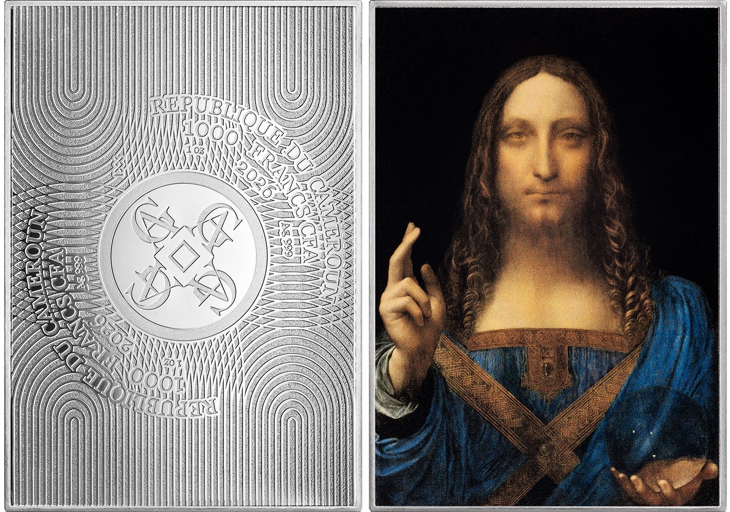 CAMEROON 1000 Francs CFA 2026 – Art Gallery : Salvator Mundi by Leonardo da Vinci – 1 oz 0.999 silver Proof – mintage 1,000 – size 51.8 x 74 mm – unknown price.