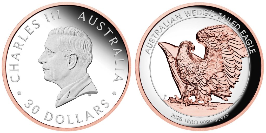 AUSTRALIA 30 Dollars 2025 – Australian Wedge-tailed Eagle – 1 kg 0.999 silver Proof (ultra high relief rose gold plated) – mintage 200 pcs only – diameter 100.9 mm – price $2,836.