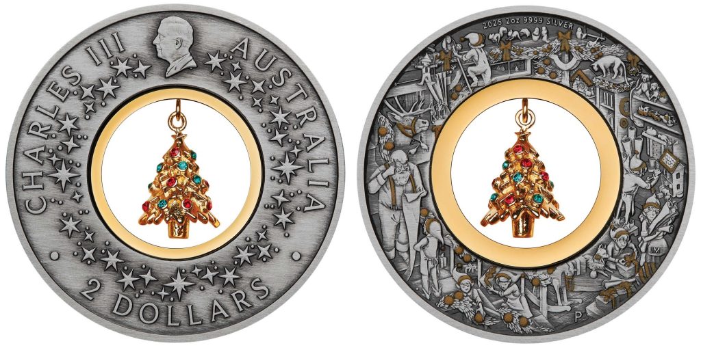 AUSTRALIA 2 Dollars 2025 – Santa’s Workshop – 2 oz 0.999 silver antique finish (Dangling gold-plated Christmas tree with Swarovski crystals in the coin’s centre) – mintage 2,500 – diameter 45.6 mm – price $247.30.