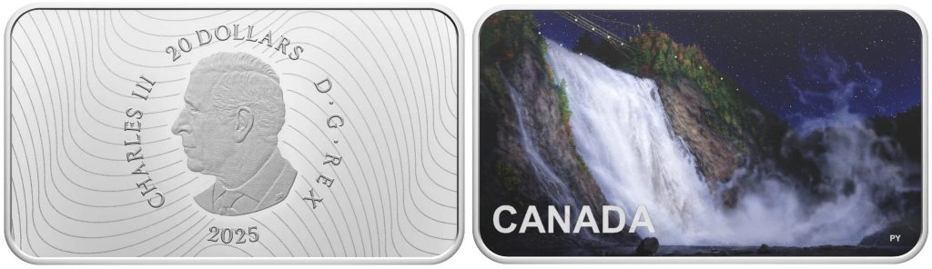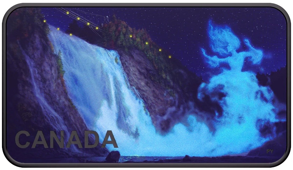 CANADA 20 Dollars 2025 – Canada hanté : La dame blanche – 31,56 g Argent 999 Proof (réagit à la lumière noire) – 6500 exemplaires – taille 28,6 x 49,8 mm – prix 94,90 euros.