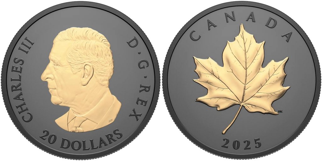CANADA 20 Dollars 2025 – Gilded Elegant Maple – 31.56 g 0.999 silver Proof (black rhodium and gold plated) – mintage 5,500 – diameter 38 mm – price $129.