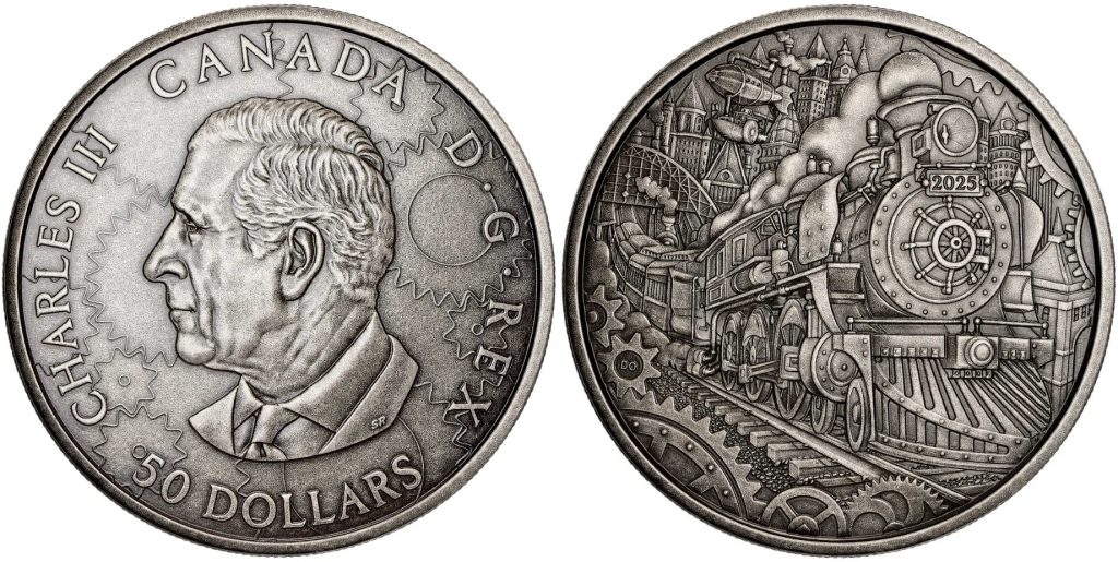 CANADA 50 Dollars 2025 – A Whimsical Tale : Steam Locomotive – 94.25 g 0.999 silver antique finish – mintage 2,500 – diameter 55 mm – price $272.35.