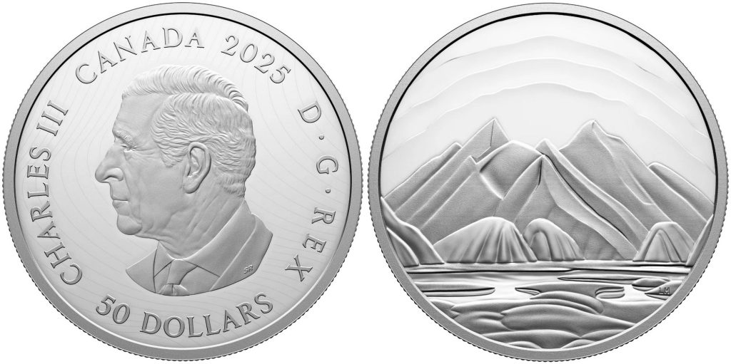 CANADA 50 Dollars 2025 – Montagnes de l’île de Baffin – 157,60 g Argent 999 Proof – 1250 exemplaires – diamètre 65,25 mm – prix 416,50 euros.