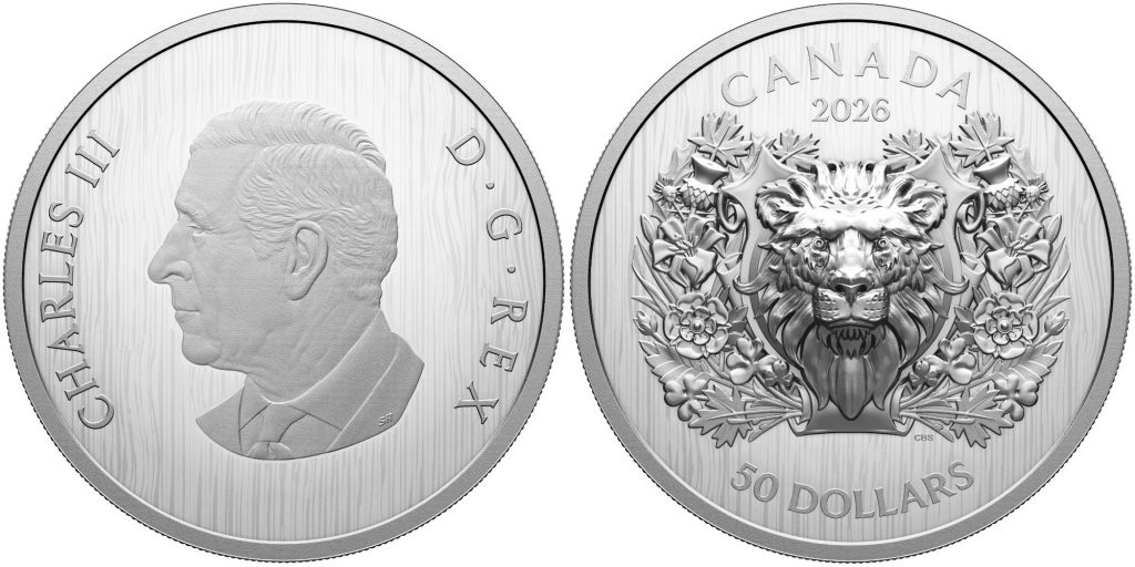 CANADA 50 Dollars 2026 – Heraldic Lion – 68 g 0.999 silver Proof (high relief) – mintage 2,000 – diameter 50 mm – price $279.50.
