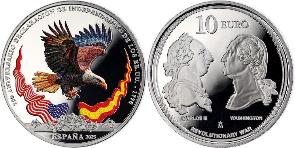 SPAIN 10 Euro 2025 – Carlos III & George Washington – 27 g 0.925 silver Proof – mintage 10,000 – diameter 40 mm – observed price $104.50.