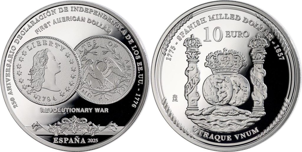 SPAIN 10 Euro 2025 – First American Dollar – 27 g 0.925 silver Proof – mintage 10,000 – diameter 40 mm – observed price $104.50.
