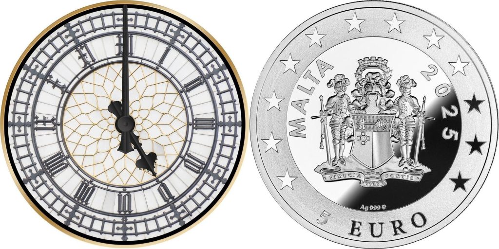 MALTA 5 Euro 2025 – Big Ben Clock – 1 oz 0.999 silver Proof – mintage 700 pcs – diameter 50 mm – observed price $162.70.
