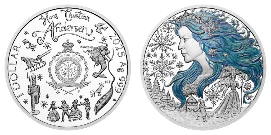 NIUE 1 Dollar 2025 – Andersen : La reine des neiges – 29 g Argent 999 Proof – 500 exemplaires seulement – diamètre 40 mm – prix 102,50 euros.