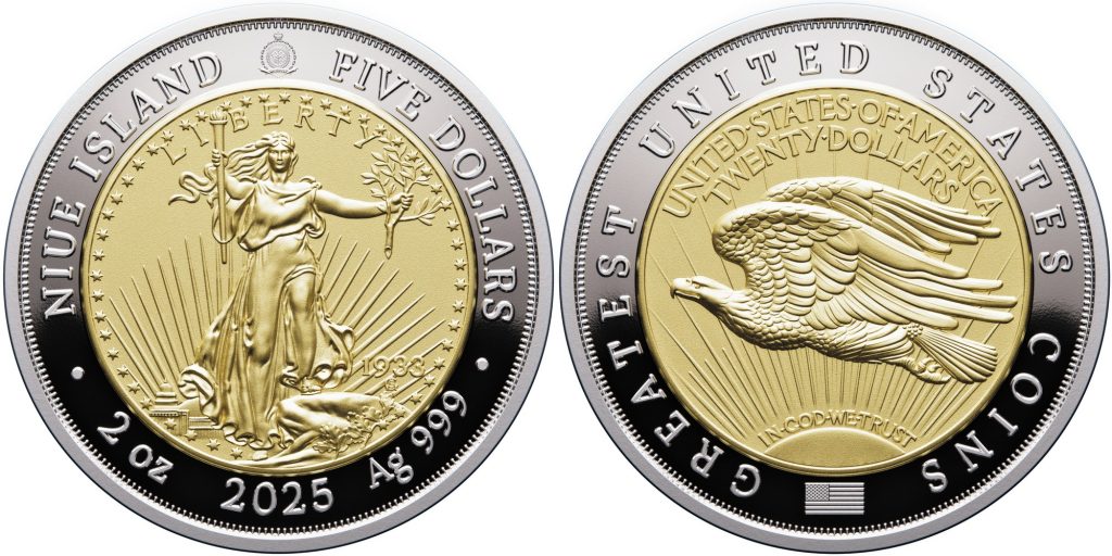 NIUE 5 Dollars 2025 – Double Eagle – 2 oz 0.999 silver Proof (selective gilding) – mintage 500 pcs only – diameter 50 mm – unknown price.