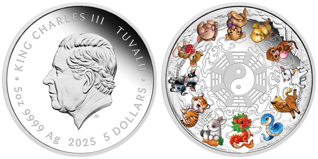 TUVALU 5 Dollars 2025 – Baby Lunar Animals – 5 oz 0.999 silver Proof – mintage 388 pcs only – diameter 61 mm – price $560.60.
