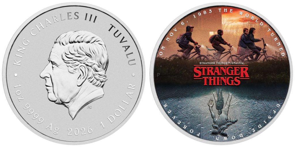 TUVALU 1 Dollar 2026 – Stranger Things : The Upside Down – 1 oz 0.999 silver BU – mintage 3,000 – diameter 40.9 mm – price $123.35.