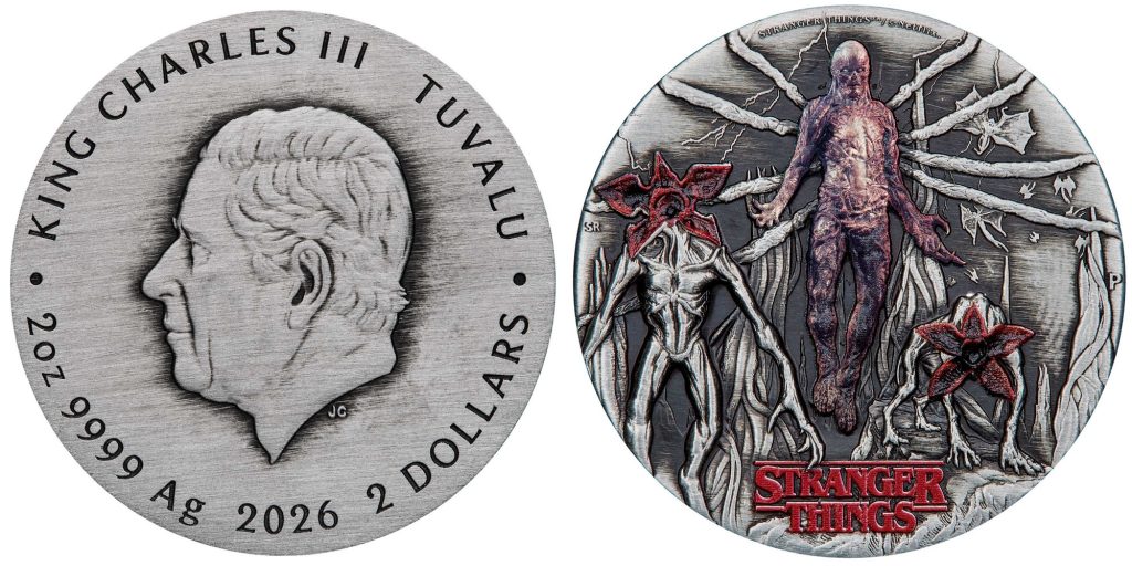 TUVALU 5 Dollars 2026 – Stranger Things : The Villains – 2 oz 0.999 silver antique finish – mintage 1,500 – diameter 40.69 mm – price $246.70.