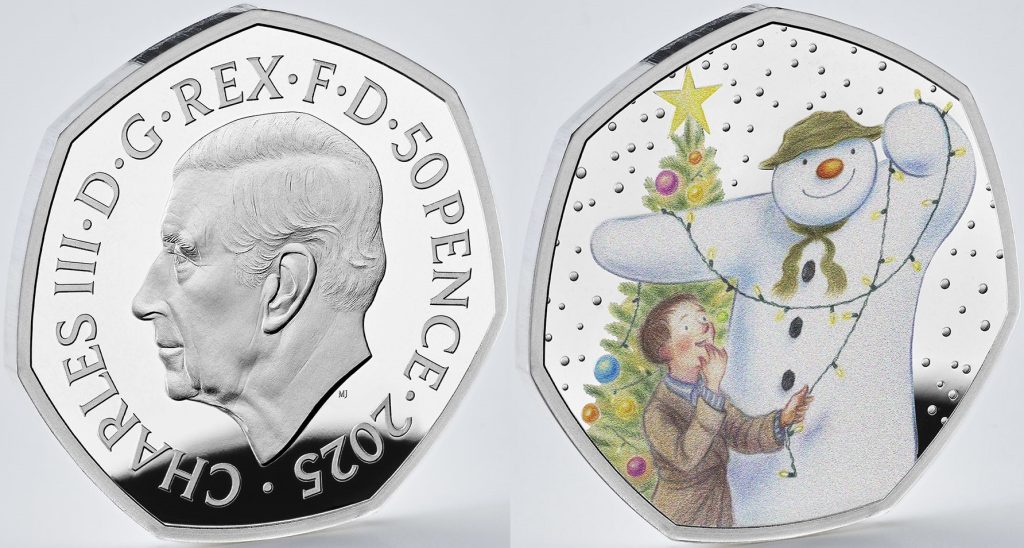 UNITED 50 Pence 2025 – Snowman – 8 g 0.925 silver Proof – mintage 5,010 – diameter 27.3 mm – price $104.