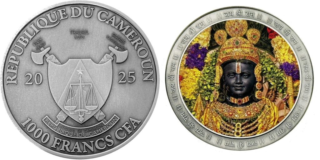 CAMEROON 1000 Francs CFA 2025 – Hindu Gods : Lord Ram Vishnu – 1 oz 0.999 silver antique finish – mintage 108 pcs only – diameter 40 mm – unknown price.