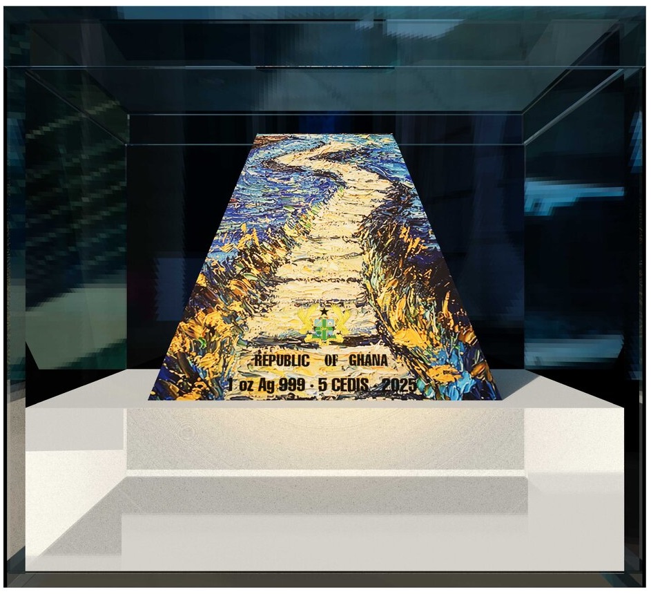 GHANA 5 Cedis 2025 – Van Gogh Illusion : Nuit étoilée – 31,1 g Argent 999 finition antique – 999 exemplaires – taille 19 x 40 x 55 mm – prix observé 129,95 euros.