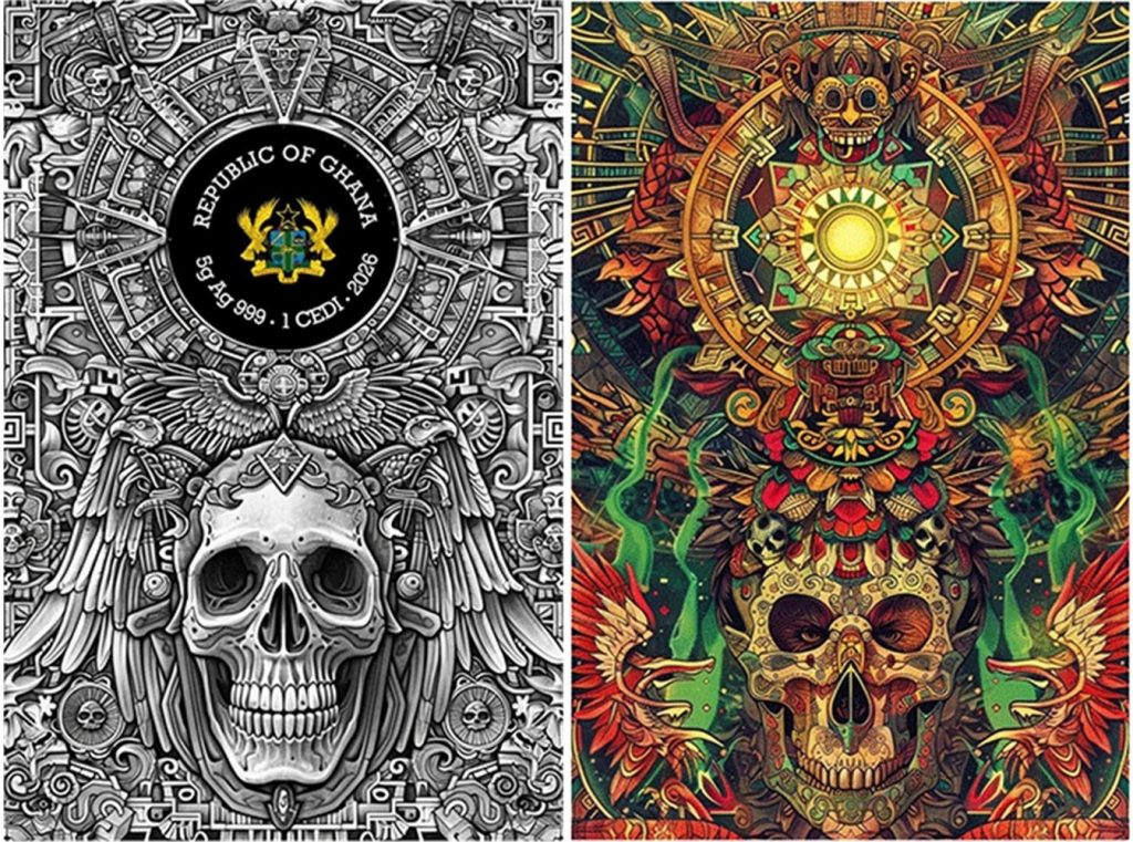 GHANA 1 Cedi 2026 – Skull of the Fifth Sun – 5 g 0.999 silver Proof – mintage 2,000 – size 100 x 150 mm – unknown price.