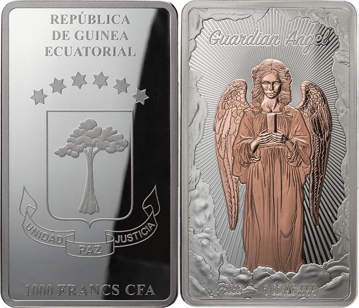 EQUATORIAL GUINEA 1000 Francs CFA 2025 – Guardian Angel – 1 oz 0.999 silver Proof-like (selective rose gold plating) – mintage 700 pcs – size and price unknown.