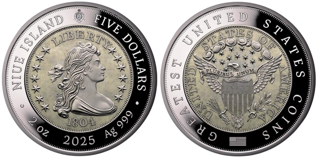NIUE 5 Dollars 2025 – 1804 Draped bust silver Dollar – 2 oz 0.999 silver Proof – mintage 500 pcs only – diameter 50 mm – unknown price.