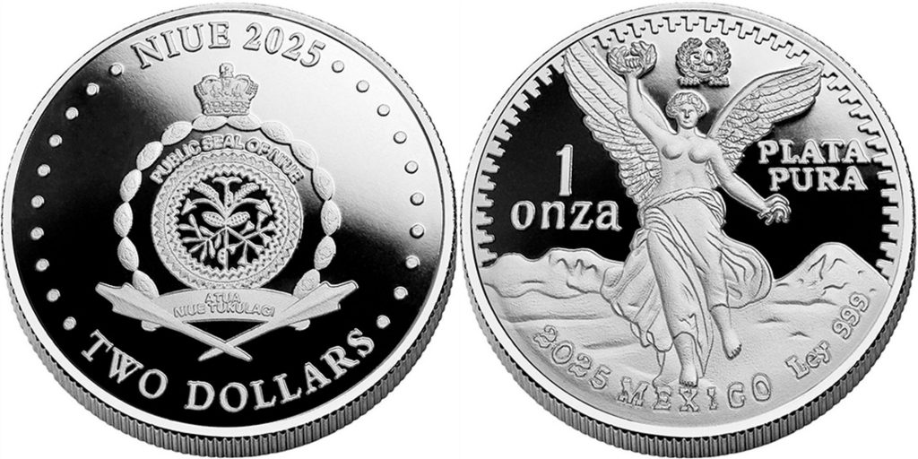 NIUE 2 Dollars 2025 – Libertad Vintage – 1 oz 0.999 silver Proof – mintage 500 sets only – diameter 36 mm – unknown price. In 4 coins set with ½ oz, ¼ oz and 1/10 oz.