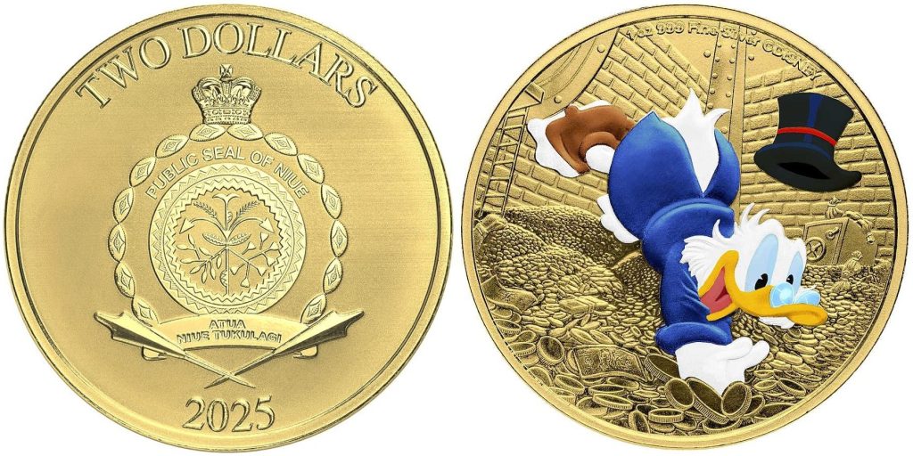NIUE 2 Dollars 2025 – Scrooge McDuck – 1 oz 0.999 silver BU (gilded) – mintage 100 pcs only – diameter 39 mm – unknown price.