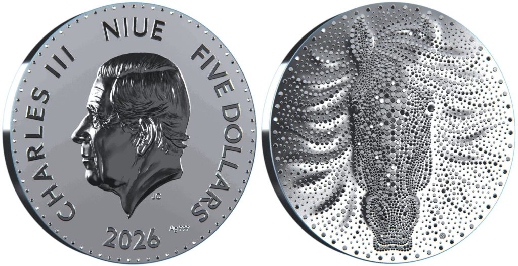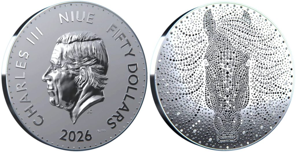 NIUE 5 Dollars 2026 – Année du Cheval (pointillisme) – 62,2 g Argent 999 Proof-like – 500 exemplaires seulement – diamètre 50 mm – prix ignoré. Existe en version d’une demi-once.