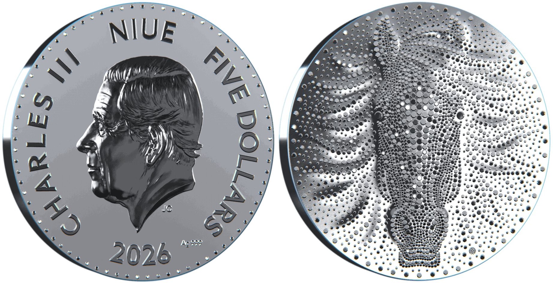 NIUE 5 Dollars 2026 – Year of the Horse (pointillism) – 2 oz 0.999 silver Proof-like – mintage 500 pcs only – diameter 50 mm – unknown price. Half-ounce version exist.