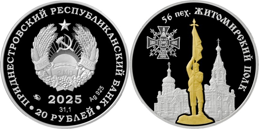 TRANSNISTRIA 20 Rubles 2025 – 56th Zhitomir Infantry Regiment – 33.94 g 0.925 silver Proof-like – mintage 100 pcs only – diameter 39 mm – unknown price.