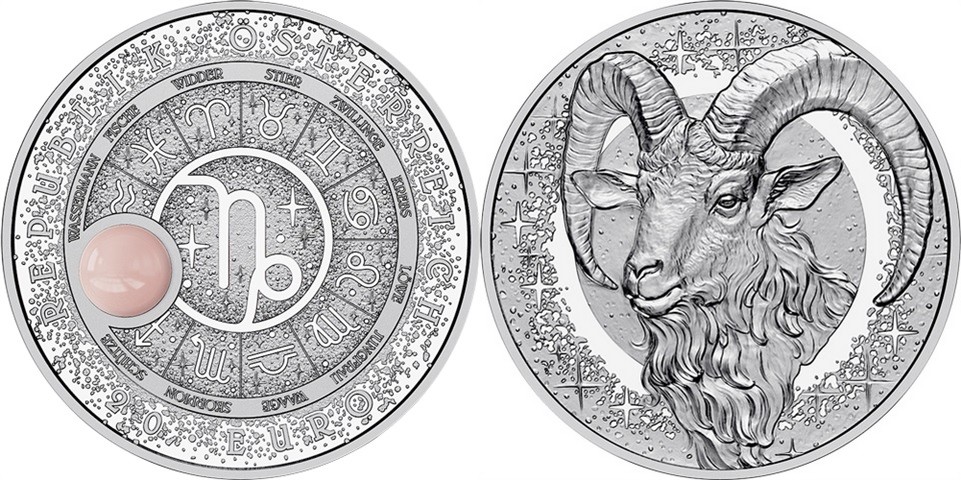 AUSTRIA 20 Euro 2025 – Zodiac Signs : Capricorn – 22.42 g 0.925 silver Proof (with rose quartz) – mintage 30,000 – diameter 34 mm – observed price $89.25.
