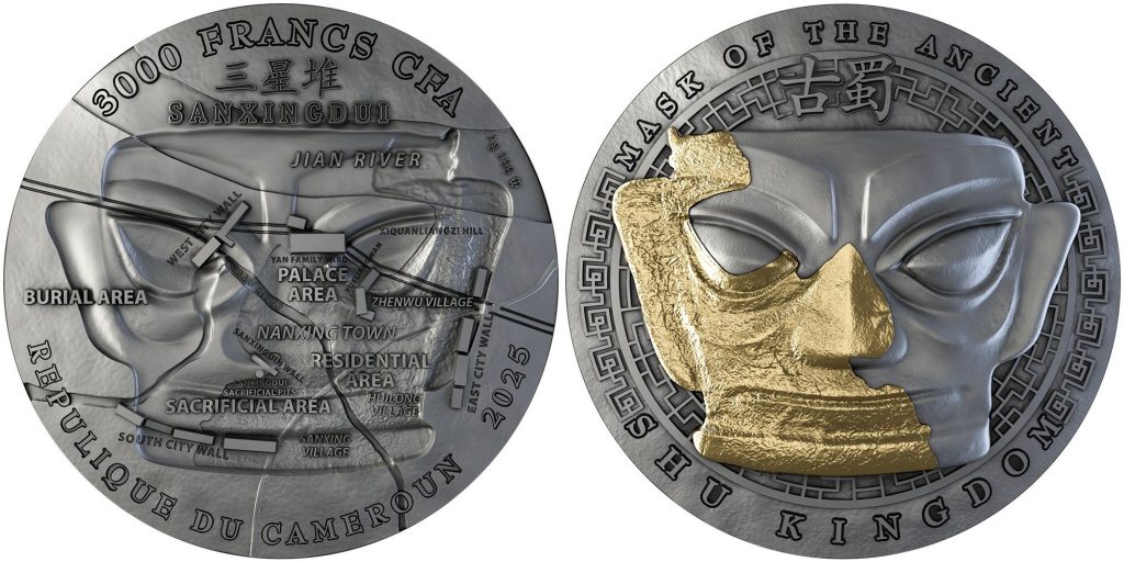 CAMEROON 3000 Francs CFA 2025 – Mask of the Ancient Shu Kingdom – 3 oz 0.999 silver antique finish (high relief) – mintage 300 pcs only – diameter 55 mm – unknown price.