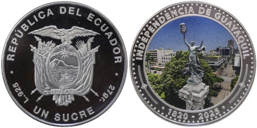 ECUADOR 1 Sucre 2025 – 205th Anniversary of the Independence of Guayaquil – 27 g 0.925 silver Proof – mintage 1,500 – diameter 40 mm – unknown price.