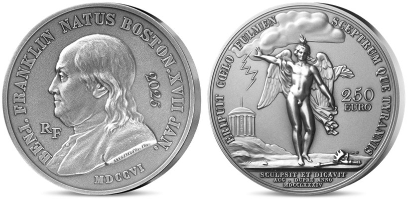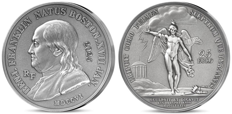 FRANCE 25 Euro 2025 – Benjamin Franklin and the winged Genius – 2 oz 0.999 silver antique finish (high relief) – mintage 2,000 – diameter 41 mm – price $391.40.