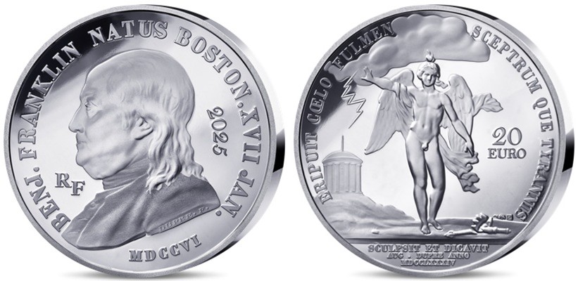 FRANCE 20 Euro 2025 – Benjamin Franklin and the winged Genius – 31.1 g 0.999 silver Proof – mintage 3,000 – diameter 37 mm – price $164.75.