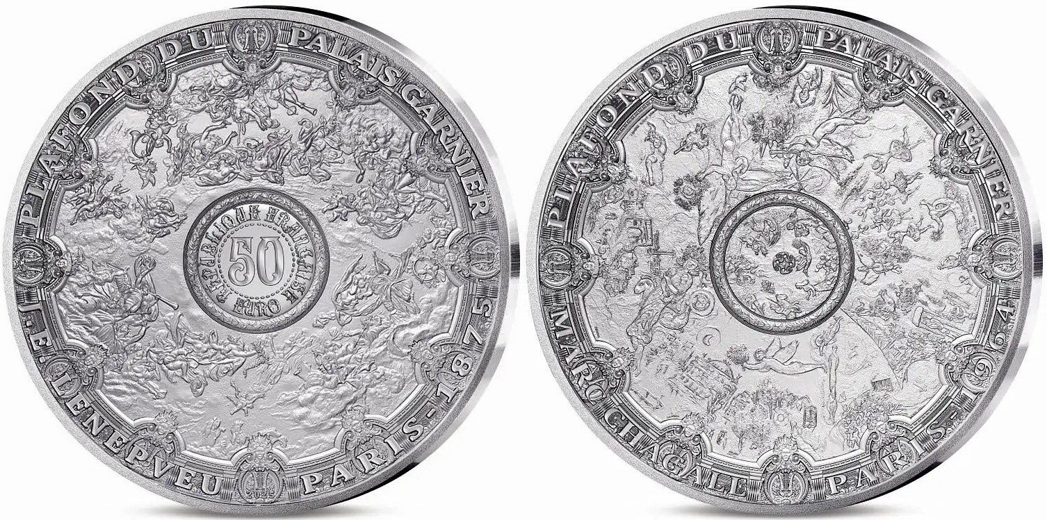 FRANCE 50 Euro 2025 – Ceilings of the Palais Garnier – 5 oz 0.999 silver Proof – mintage 500 pcs only – diameter 50 mm – price $876.30.