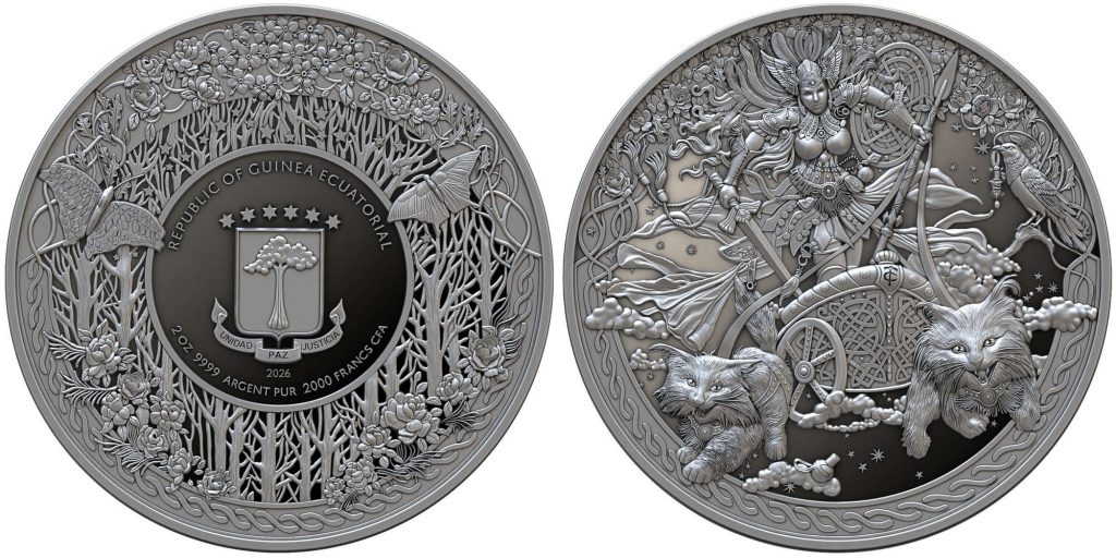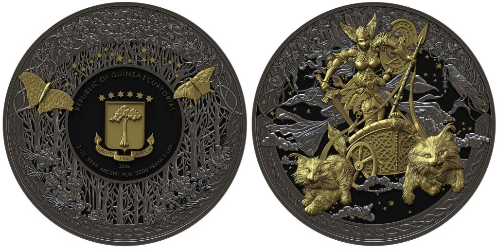 EQUATORIAL GUINEA 2000 Francs CFA 2026 – Goddess Freya – 2 oz 0.999 silver BU (black ruthenium and gold plated) – mintage 222 pcs only – diameter 50 mm – unknown price.