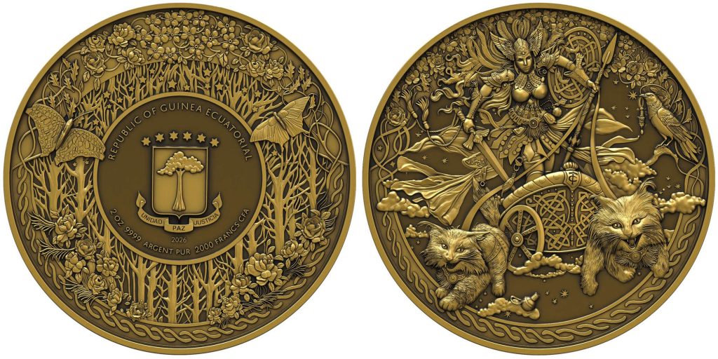 EQUATORIAL GUINEA 2000 Francs CFA 2026 – Goddess Freya – 2 oz 0.999 silver antique finish (gilded) – mintage 222 pcs only – diameter 50 mm – unknown price.