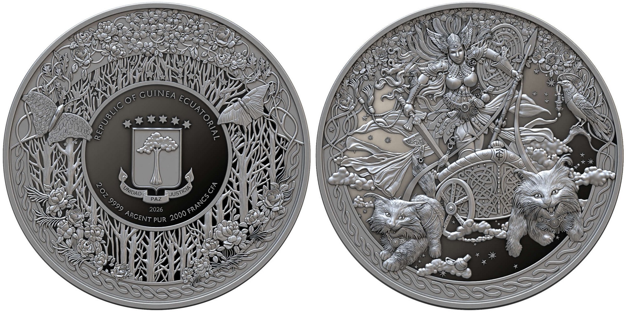 EQUATORIAL GUINEA 2000 Francs CFA 2026 – Goddess Freya – 2 oz 0.999 silver Proof – mintage 111 pcs only – diameter 50 mm – unknown price.