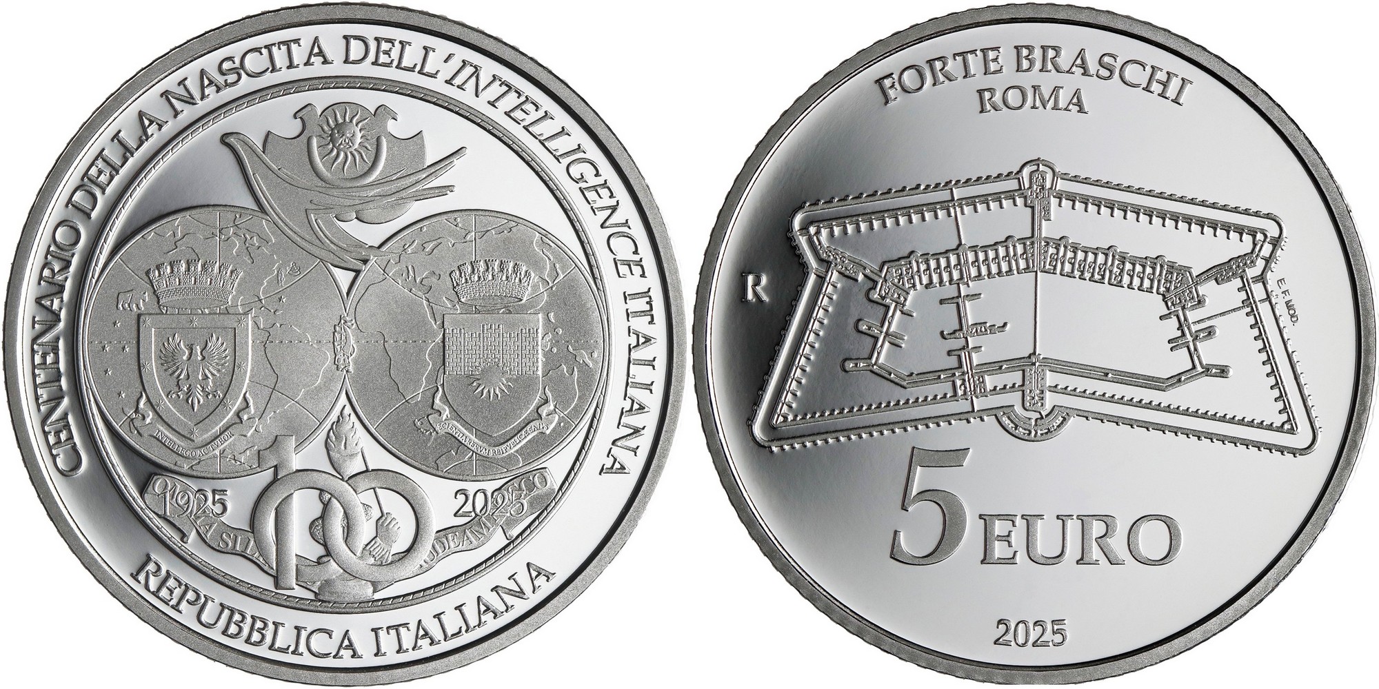 ITALY 5 Euro 2025 – Centenary of Italian Intelligence – 18 g 0.925 silver Proof – mintage 3,000 – diameter 32 mm – unknown price.