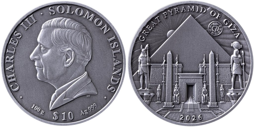 SOLOMON ISL 10 Dollars 2026 – Great Pyramid of Giza – 100 g 0.999 silver antique finish – mintage 799 pcs – diameter 55 mm – unknown price.