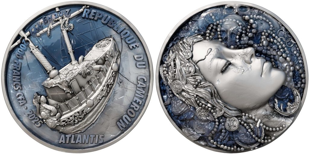 CAMEROON 2000 Francs CFA 2025 – Atlantis – 2 oz 0.999 silver antique finish (high relief with enamel) + 11.5 oz Copper – mintage 199 pcs sonly – diameter 80 mm – unknown price.
