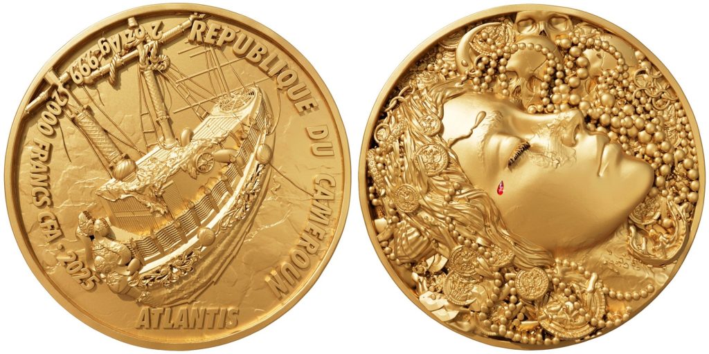 CAMEROUN 2000 Francs CFA 2025 – Atlantis – 62,2 g Argent 999 finition antique (haut relief plaqué or) + 357,65 g cuivre – 99 exemplaires seulement – diamètre 80 mm – prix ignoré.