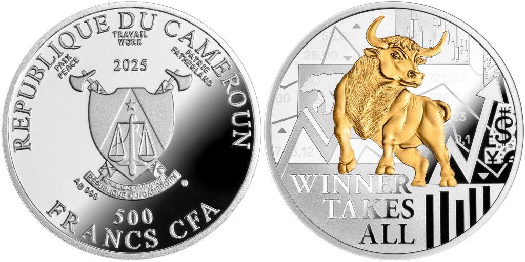 CAMEROON 500 Francs CFA 2025 – The Winner Takes All – 17.5 g 0.999 silver Proof – mintage 700 pcs – diameter 38.61 mm – unknown price.