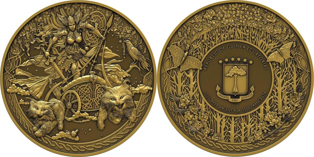 GUINEE EQUATORIALE 2000 Francs CFA 2026 – Freyja – 62,2 g Argent 999 finition antique (plaqué or) – 222 exemplaires seulement – diamètre 50 mm – prix observé 289,95 euros.