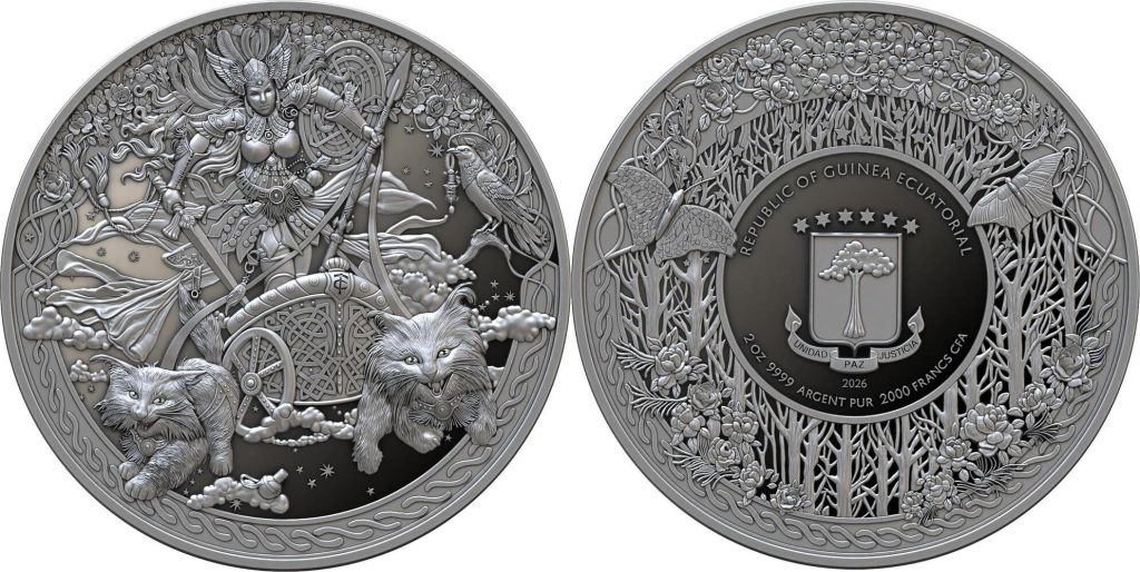 EQUATORIAL GUINEA 2000 Francs CFA 2026 – Freyja – 2 oz 0.999 silver Proof – mintage 111 pcs only – diameter 50 mm – observed price $295.