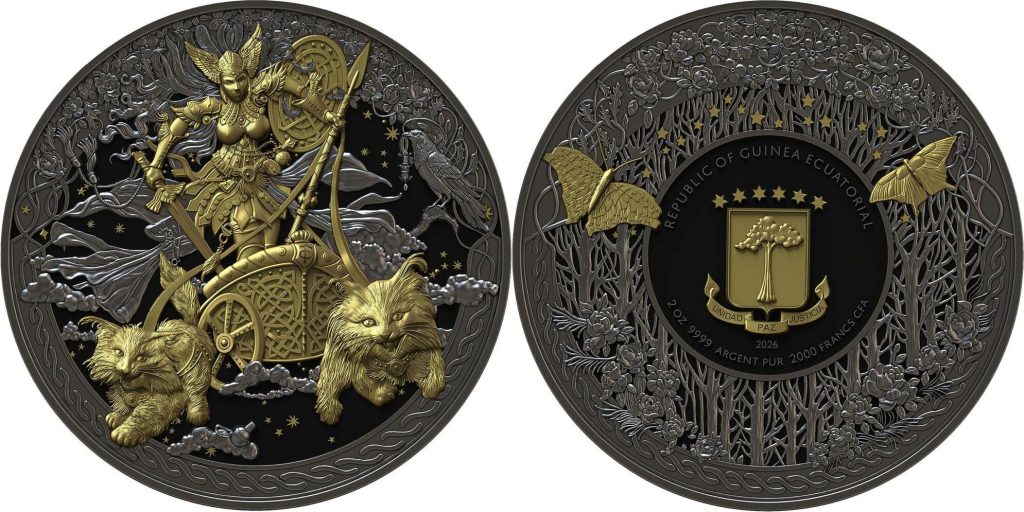 EQUATORIAL GUINEA 2000 Francs CFA 2026 – Freyja – 2 oz 0.999 silver BU (black ruthenium and gold plated) – mintage 222 pcs only – diameter 50 mm – observed price $354.