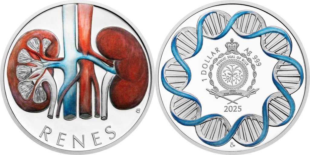 NIUE 1 Dollar 2025 – Human Body : Kidneys – 1 oz 0.999 silver Proof – mintage 1,000 – diameter 37 mm – observed price $117.