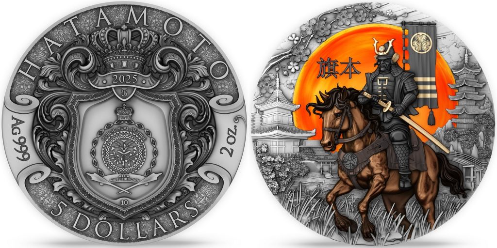 NIUE 5 Dollars 2025 – Hatamoto – 2 oz 0.999 silver antique finish – mintage 500 pcs only – diameter 45 mm – unknown price.