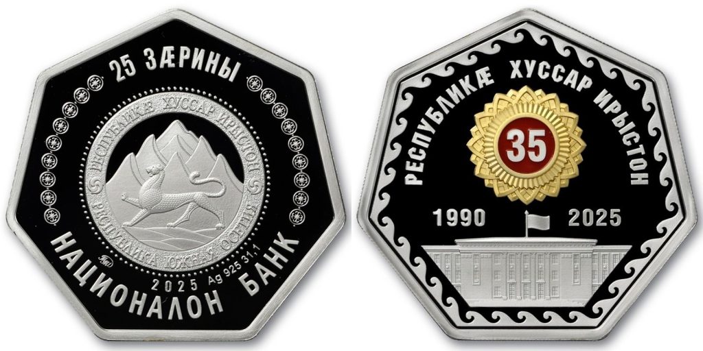 SOUTH OSSETIA 25 Zarin 2025 – 35th anniversary of the formation of the Republic of South Ossetia – 33.94 g 0.925 silver Proof – mintage 700 pcs – diameter 40 mm – unknown price.