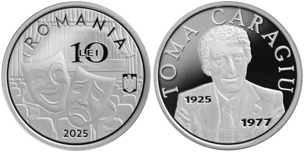 ROMANIA 10 Lei 2025 – 100 years since the birth of Toma Caragiu – 31.1 g 0.999 silver Proof – mintage 5,000 – diameter 37 mm – unknown price.