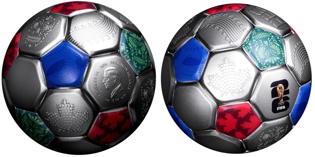 ILES SALOMON 10 Dollars 2026 – Coupe du monde FIFA 2026 – 93,3 g Argent 999 finition antique – 2026 exemplaires – diamètre ignoré – prix observé 399 euros.