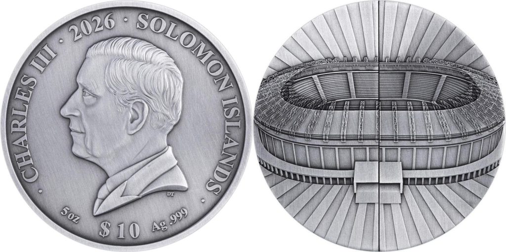 ILES SALOMON 10 Dollars 2026 – Stade de la coupe du monde de foot 2026 – 155,5 g Argent 999 finition antique – 299 exemplaires seulement – diamètre 60 mm – prix observé 749,95 euros.